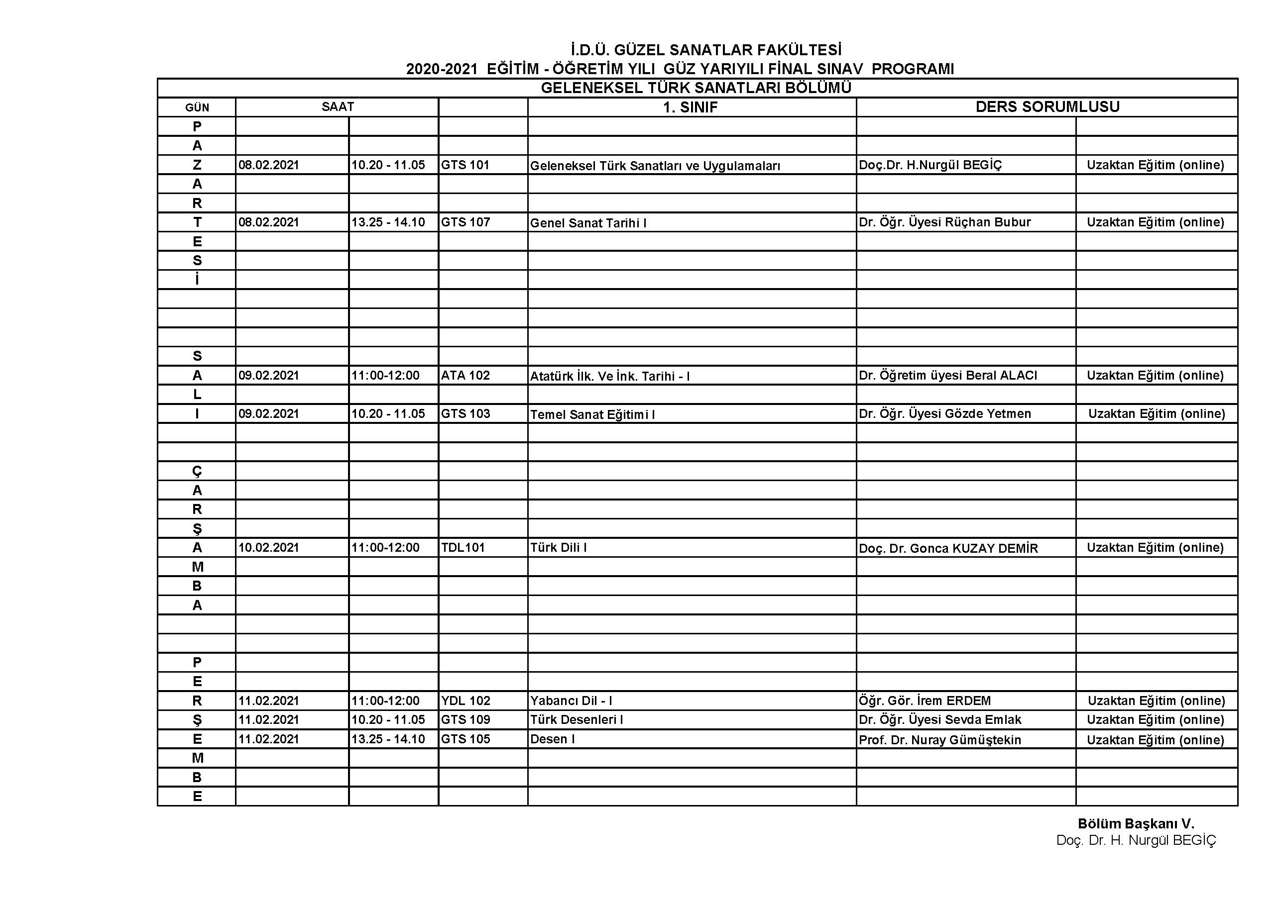 Geleneksel Türk Sanatları Bölümü 2020-2021 Güz Dönemi Final Tarihleri