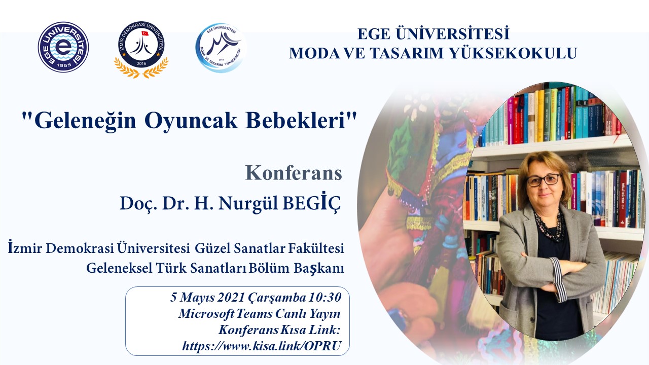 İzmir Demokrasi Üniversitesi Güzel Sanatlar Fakültesi Geleneksel Türk Sanatları Bölüm Başkanı Doç. Dr. H. Nurgül BEGİÇ, 5 Mayıs 2021 saat: 10:30'da "Geleneğin Oyuncak Bebekleri" konulu konferans gerçekleştirecektir. Bilgi için tıklayınız.